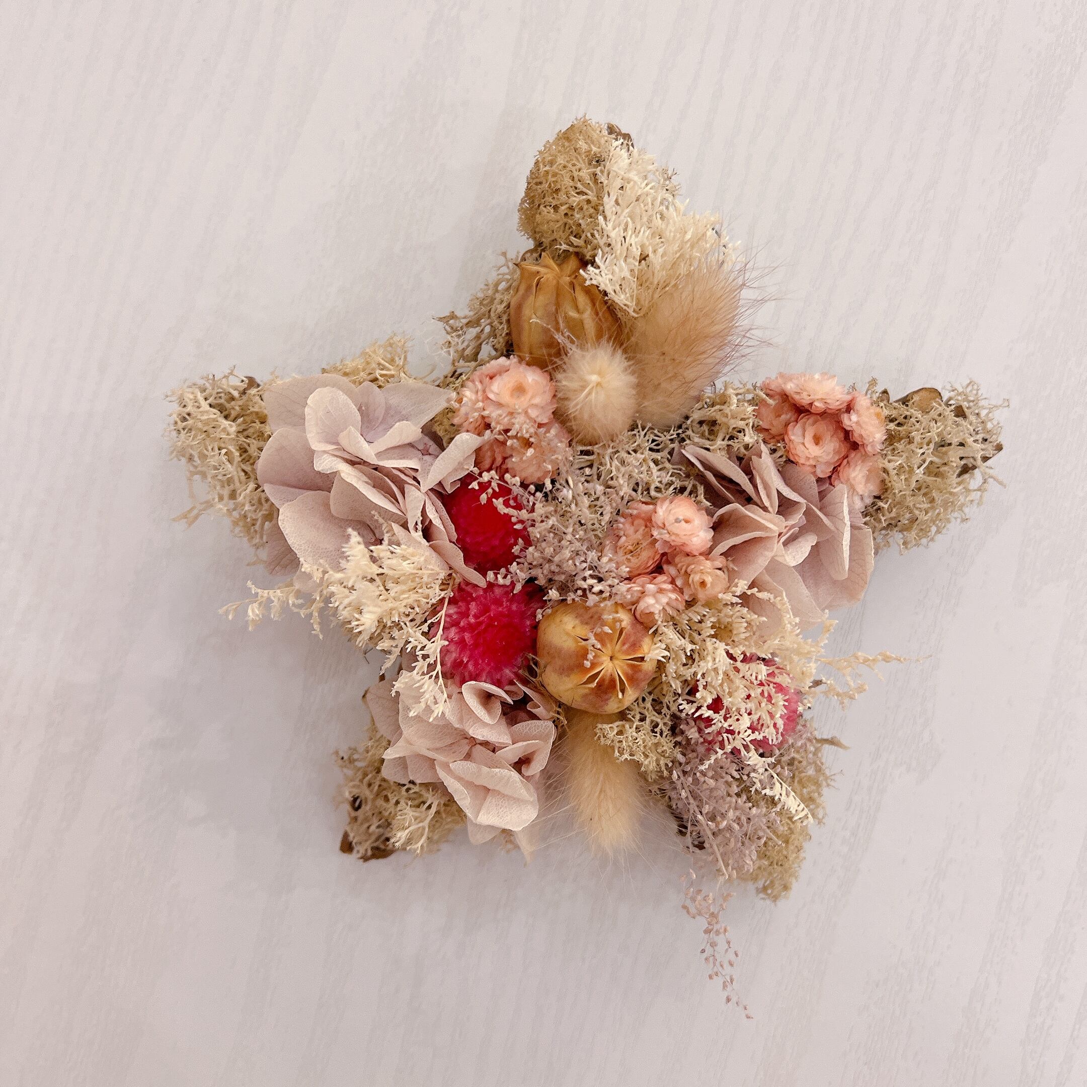 絶妙な配色のプリザーブドフラワーを組み合わせた1点物の星リース。