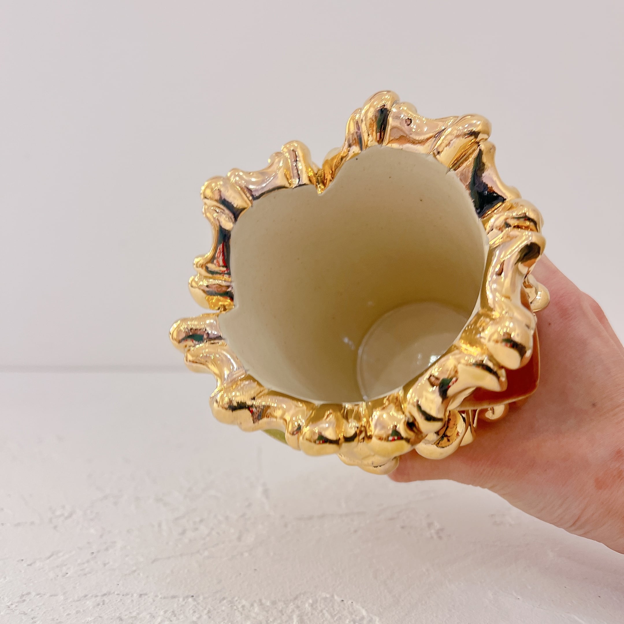キラキラと輝くゴールドカラーは純金を主原料とした陶磁器用の金彩を使用して焼き付けています。