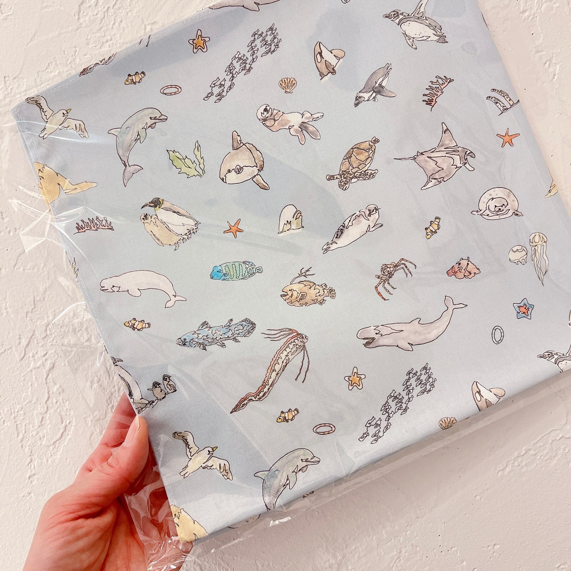 日本最大級のファブリック専門店「大塚屋」とのコラボ生地第二弾"水族館柄"を使用したハンカチ。