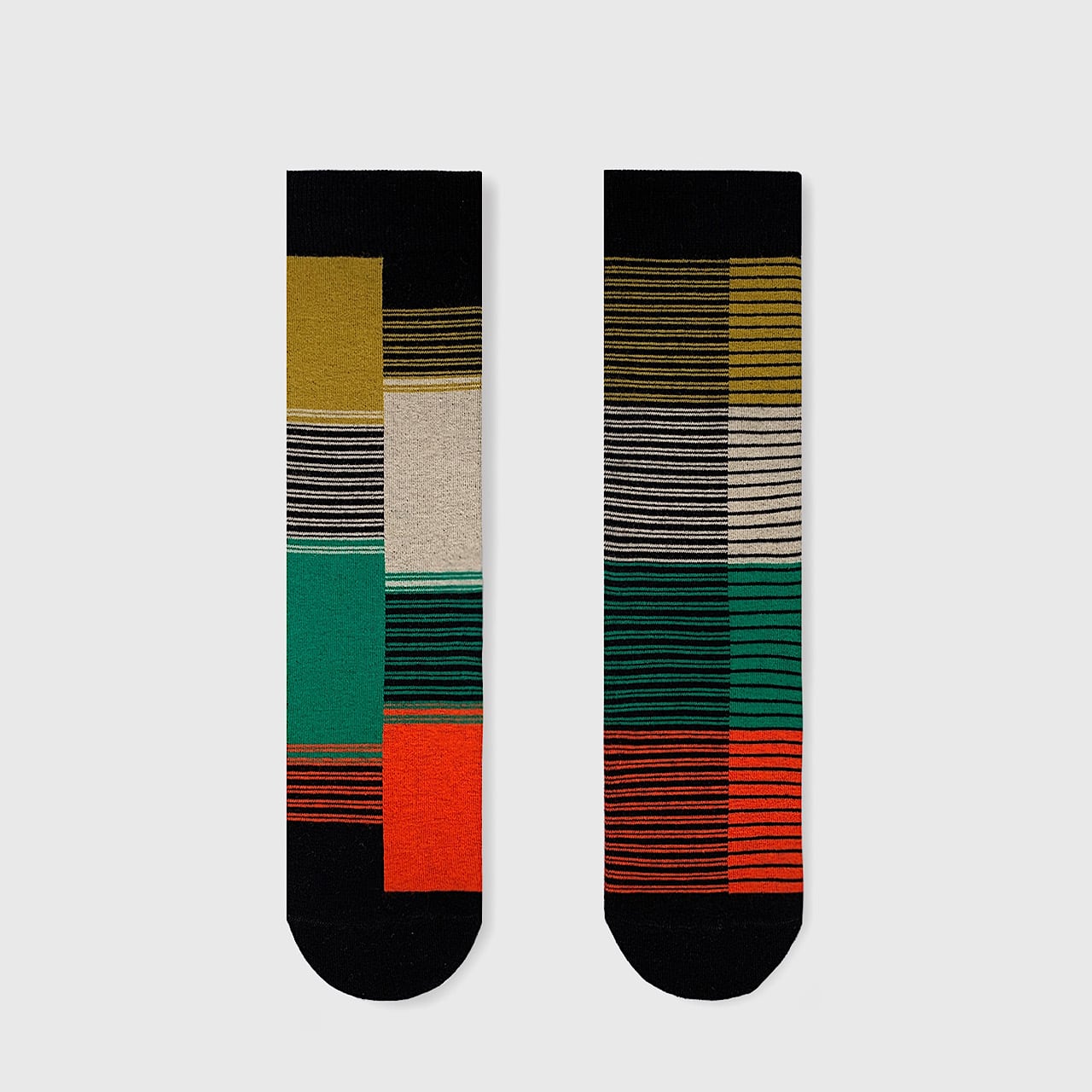 ボーダーをブロックに見立てて左右非対称にデザインした、ボーダー好きさんのための靴下です。