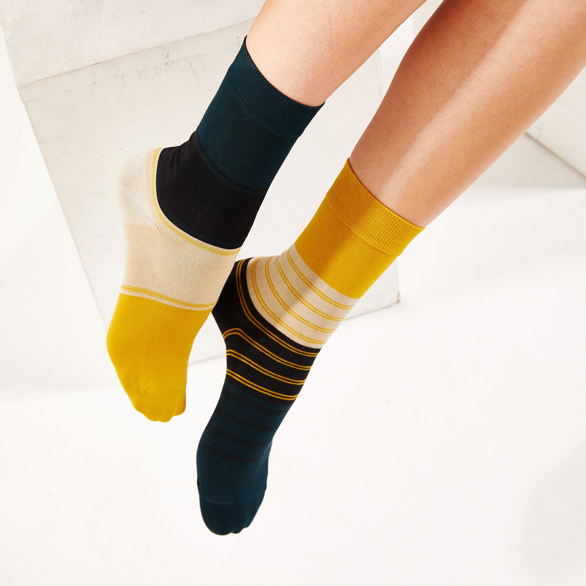 スモーキーなイエローをメインカラーに大人の女性にとってコーディネートしやすい靴下に仕上げています。